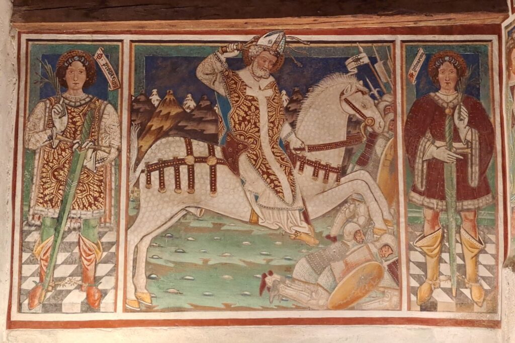 02.12.2025: Riale di Prugiasco. Der heilige Ambrosius zu Pferd, er wird flankiert von Protavius (l.) und Gervasius (r.). Die fantastischen Fresken in der Kirche San Carlo di Negrentino